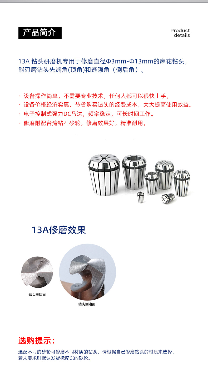 13A型具有刃磨先端角(顶角)、逃隙角(后角),设有静点(中心点)大小调整功能,能随钻孔材料材质,速度做有效配合,能控制工件的品质与精度,并延长钻头的寿命。